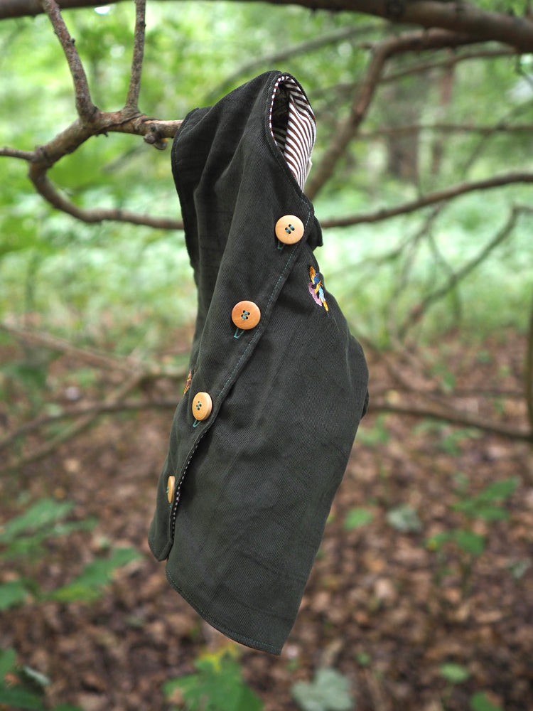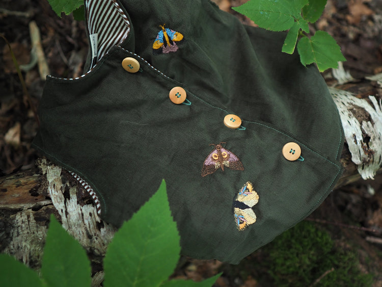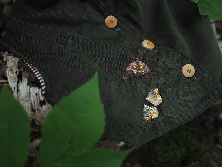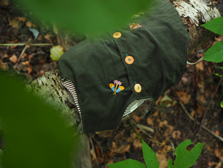 Eine leichte Weste aus feinem, weichem Cord. Perfekt für die Übergangszeit oder zum Überziehen an kühleren Tagen. Die Weste ist mit zarten Stickereien von Schmetterlingen und Faltern verziert und bekommt dadurch einen besonderen, liebevollen Charakter. Innen ist sie mit einem gestreiften Stoff gefüttert und angenehm zu tragen.