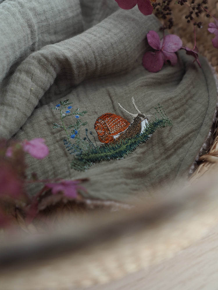 Das Highlight: die liebevoll gestickte Schnecke zwischen Blüten und Gräsern 🐌🌿 ein kleines Unikat, das dein Stück zu etwas ganz Besonderem macht.