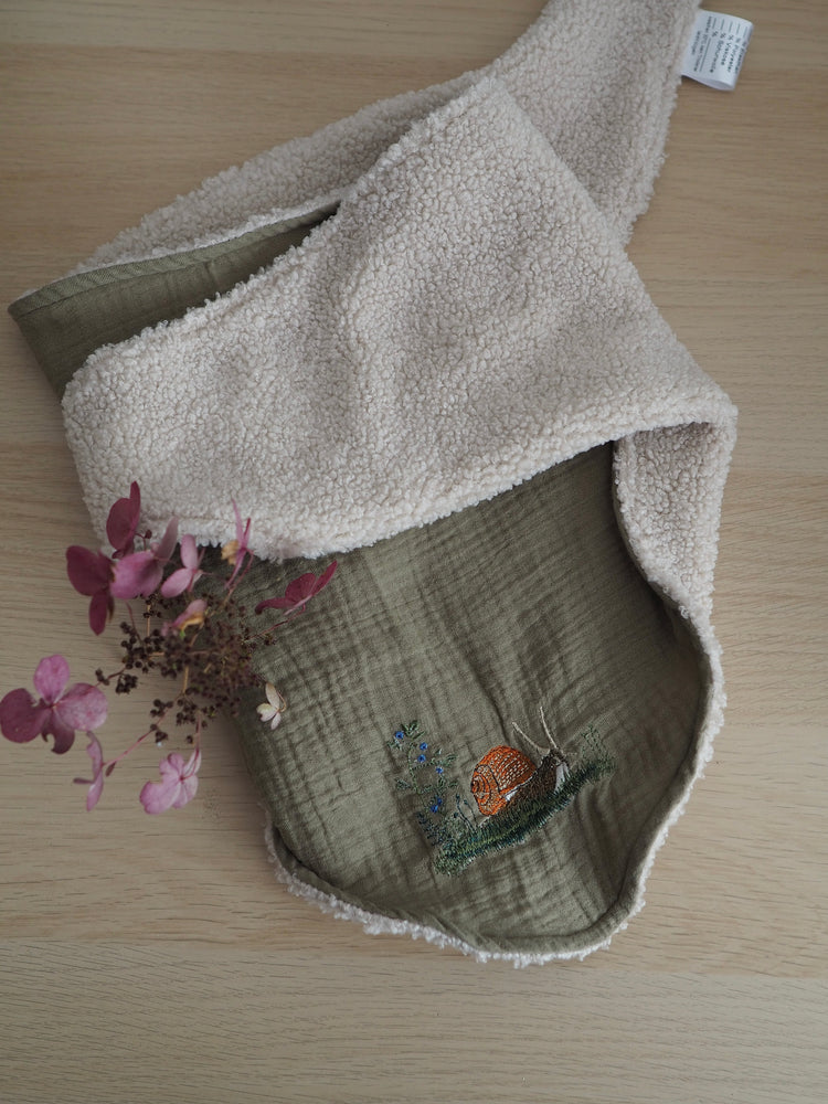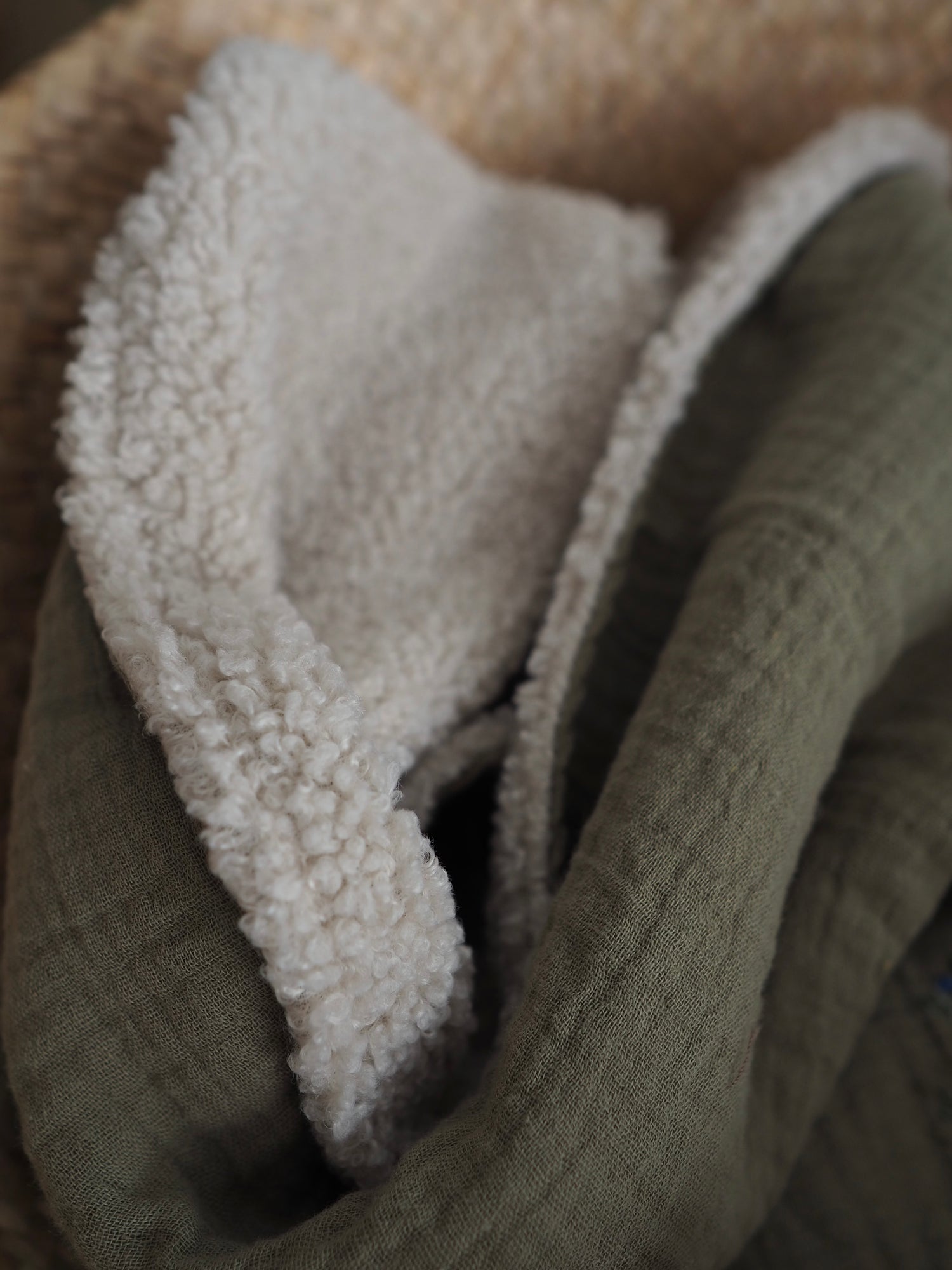 Dieses besondere Teil ist aus hochwertigem Musselin gefertigt und innen mit flauschigem Teddyplüsch gefüttert. Perfekt für gemütliche Tage und wohlig warme Stunden.