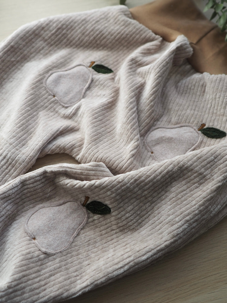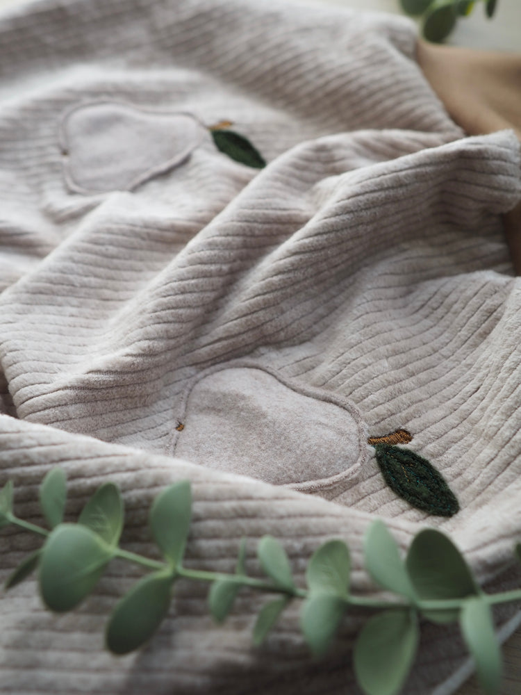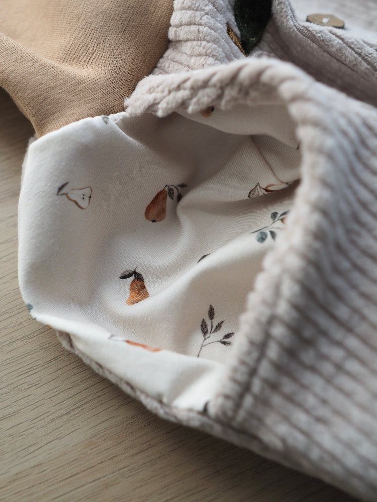 - Besonderheit: Außen weicher Cord in Naturtönen mit applizierten Birnen.