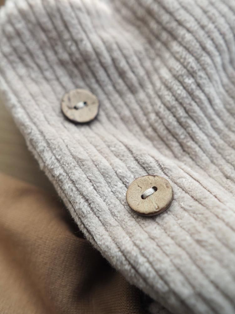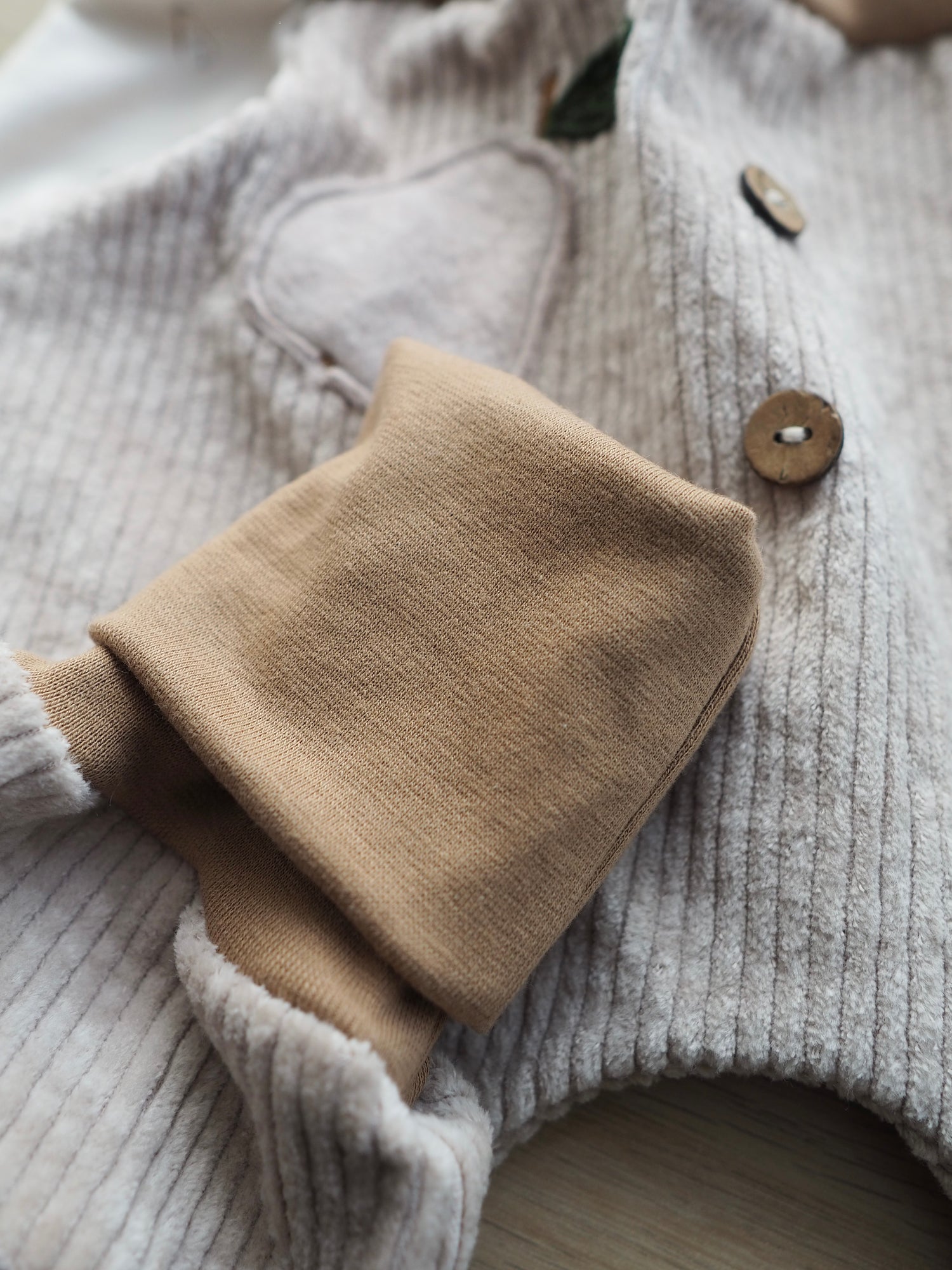 - Bündchen: Elastische Mitwachsbündchen in warmem Braun – sitzen bequem und wachsen lange mit.