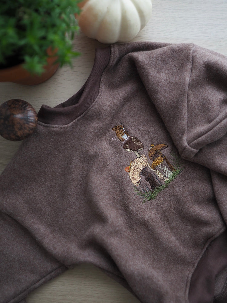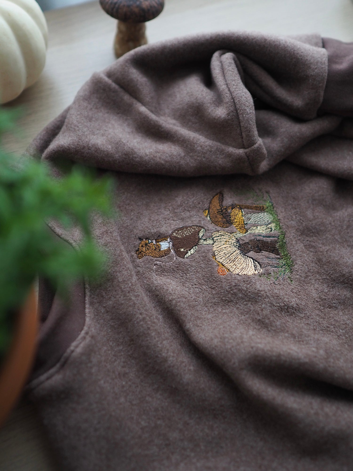Die liebevolle Pilz-Stickerei verleiht dem Stück seinen besonderen Charakter – inspiriert von Spaziergängen durch den herbstlichen Wald.