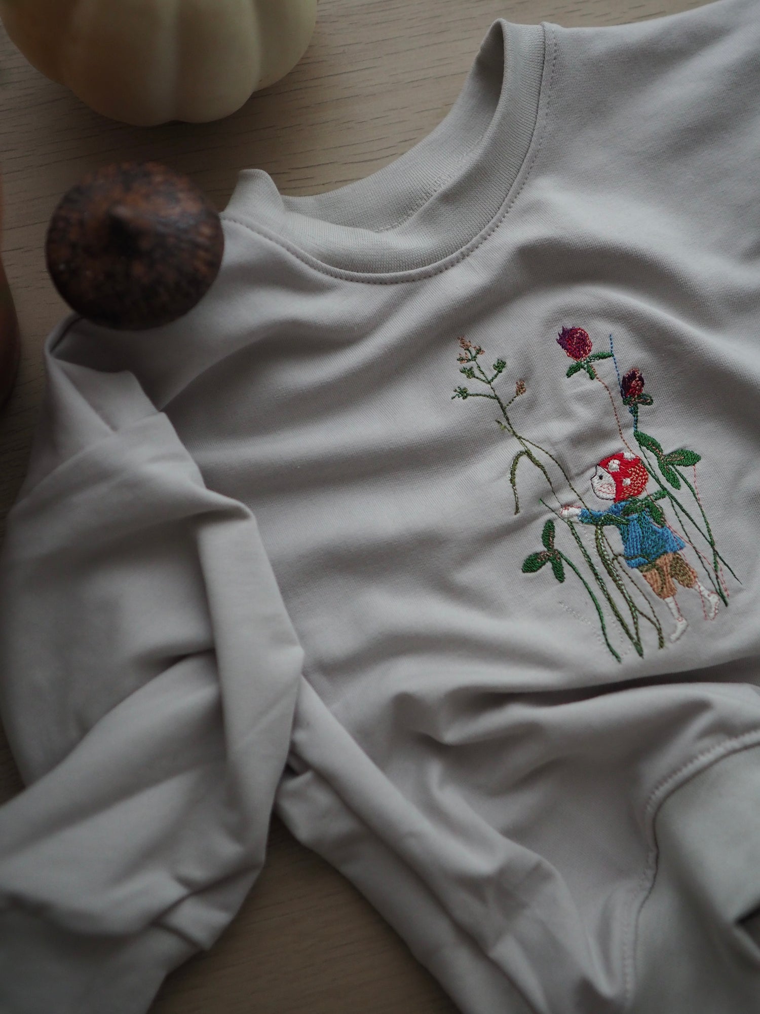 Ein liebevoll bestickter Pullover, der kleine Geschichten erzählt – von neugierigen Wichteln, die zwischen den hohen Rosenstielen nach Abenteuern suchen.